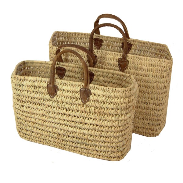 Mooie rieten tas gemaakt van palmblad met stevige leren handvaten.