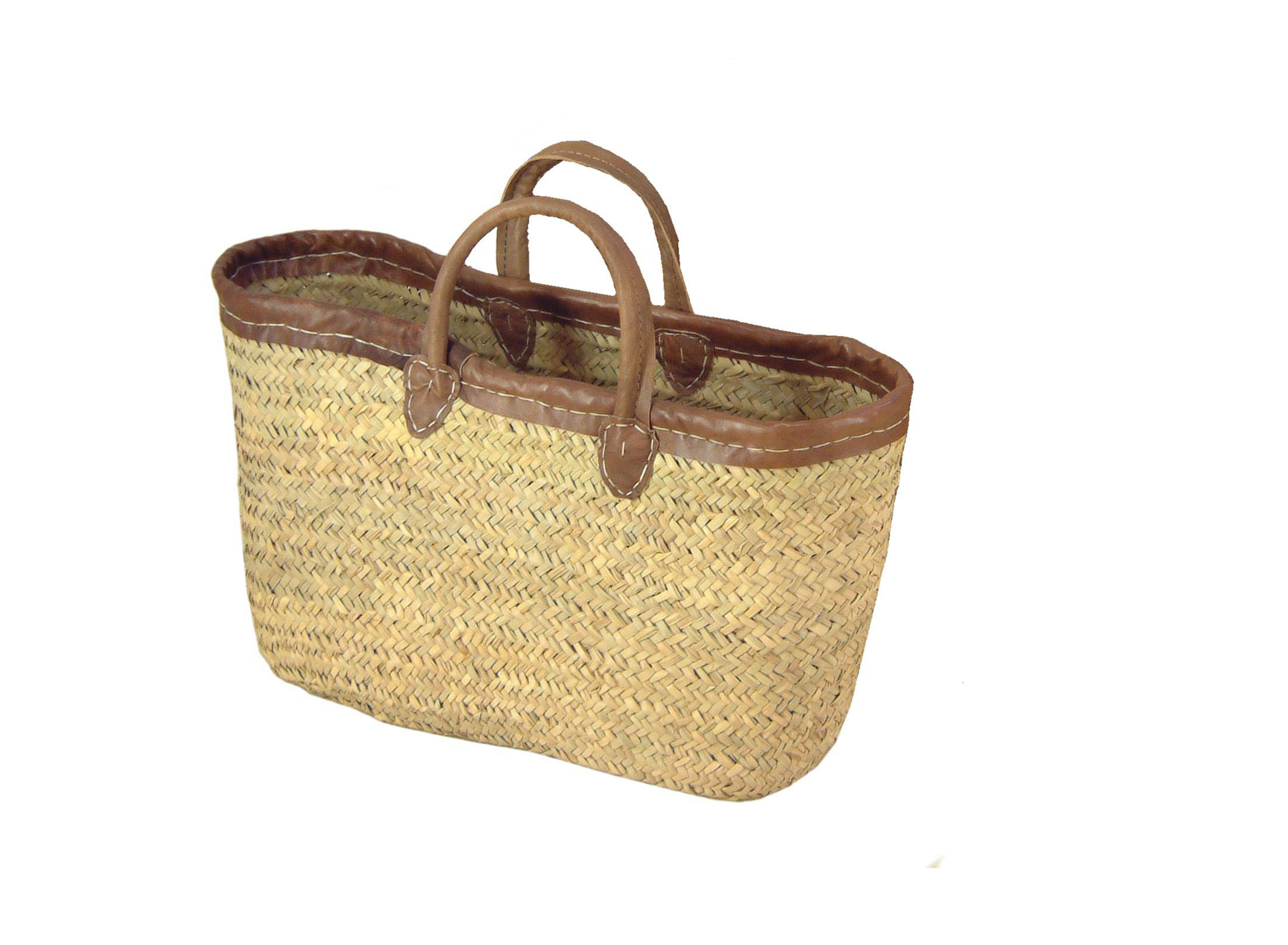Lichtgewicht rieten tas met stevige leren handvaten en een decoratieve leren rand.