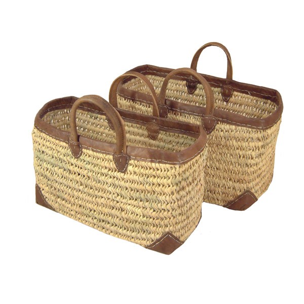 Hippe draagtas gemaakt van palmblad met stevige leren handvaten en leren sier rand.