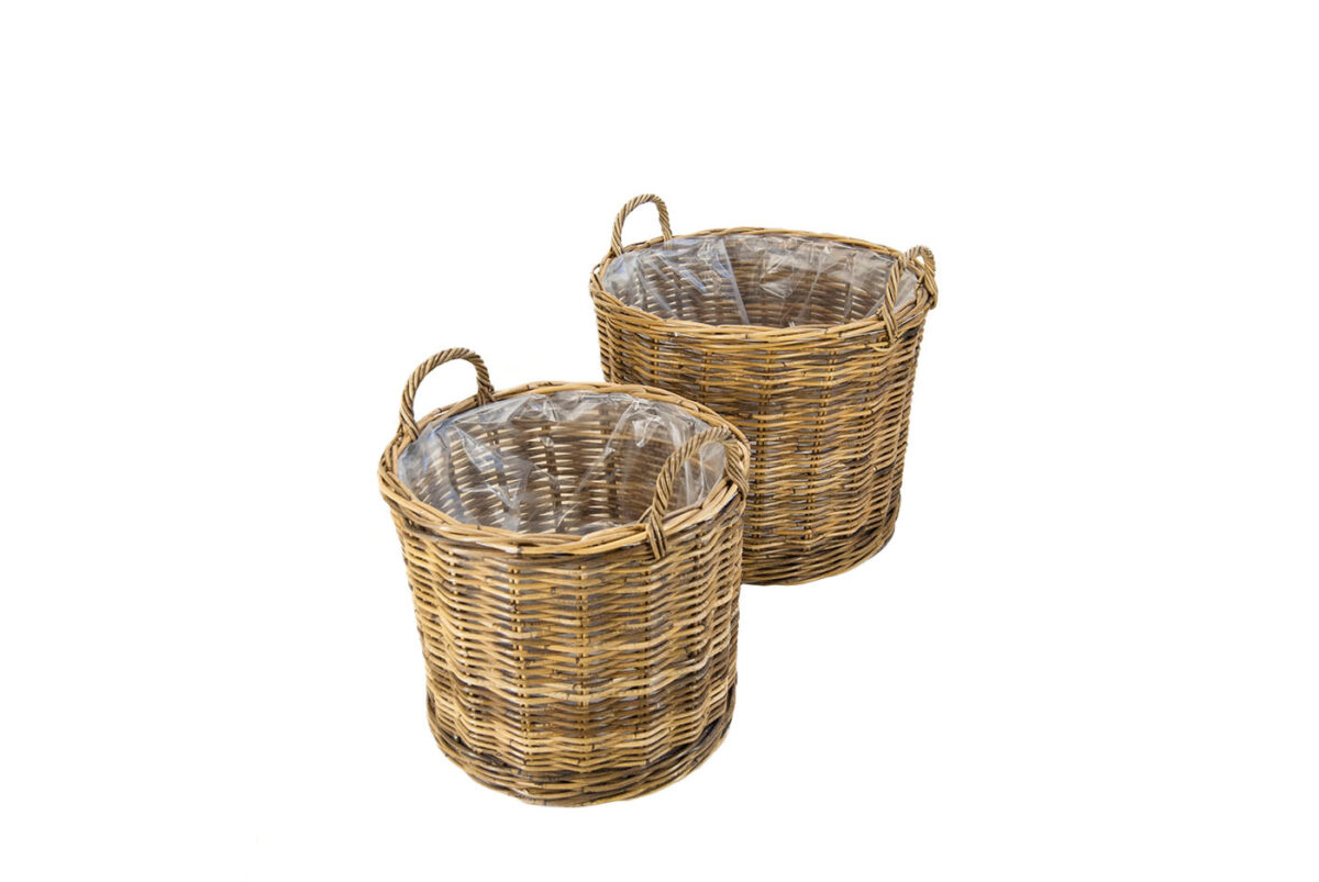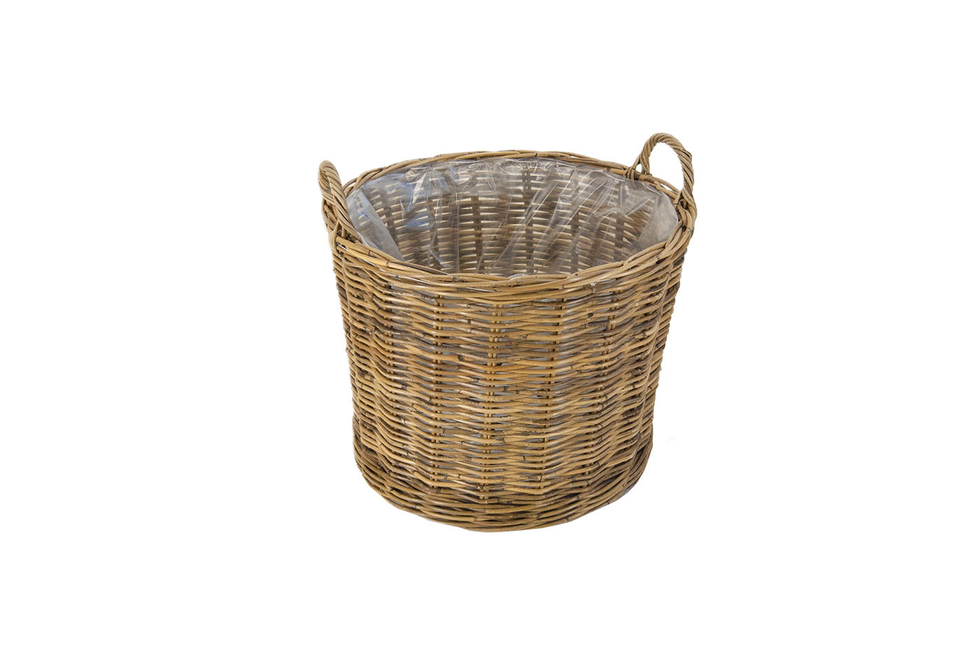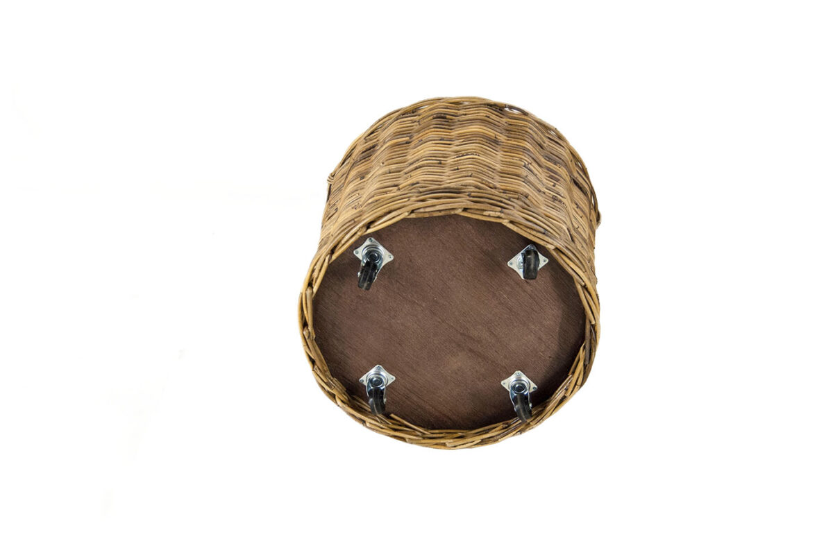 Stevige ronde mand met onzichtbare wielen. De mand heeft een houten bodem en is met plastic gevoerd.