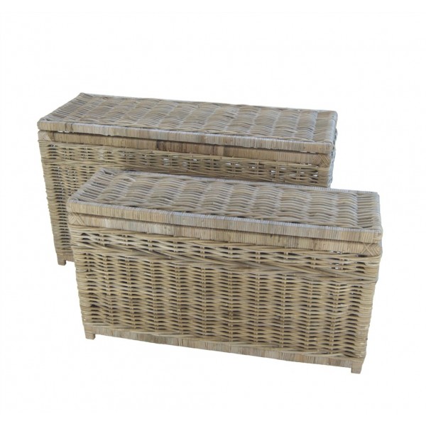 Deze hoge smalle rieten mand is zeer gebruiksvriendelijk door de stevige scharnieren in het deksel en gemakkelijk verplaatsbaar door de handgrepen in de zijkant.