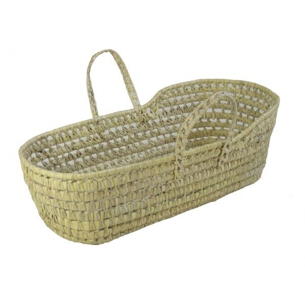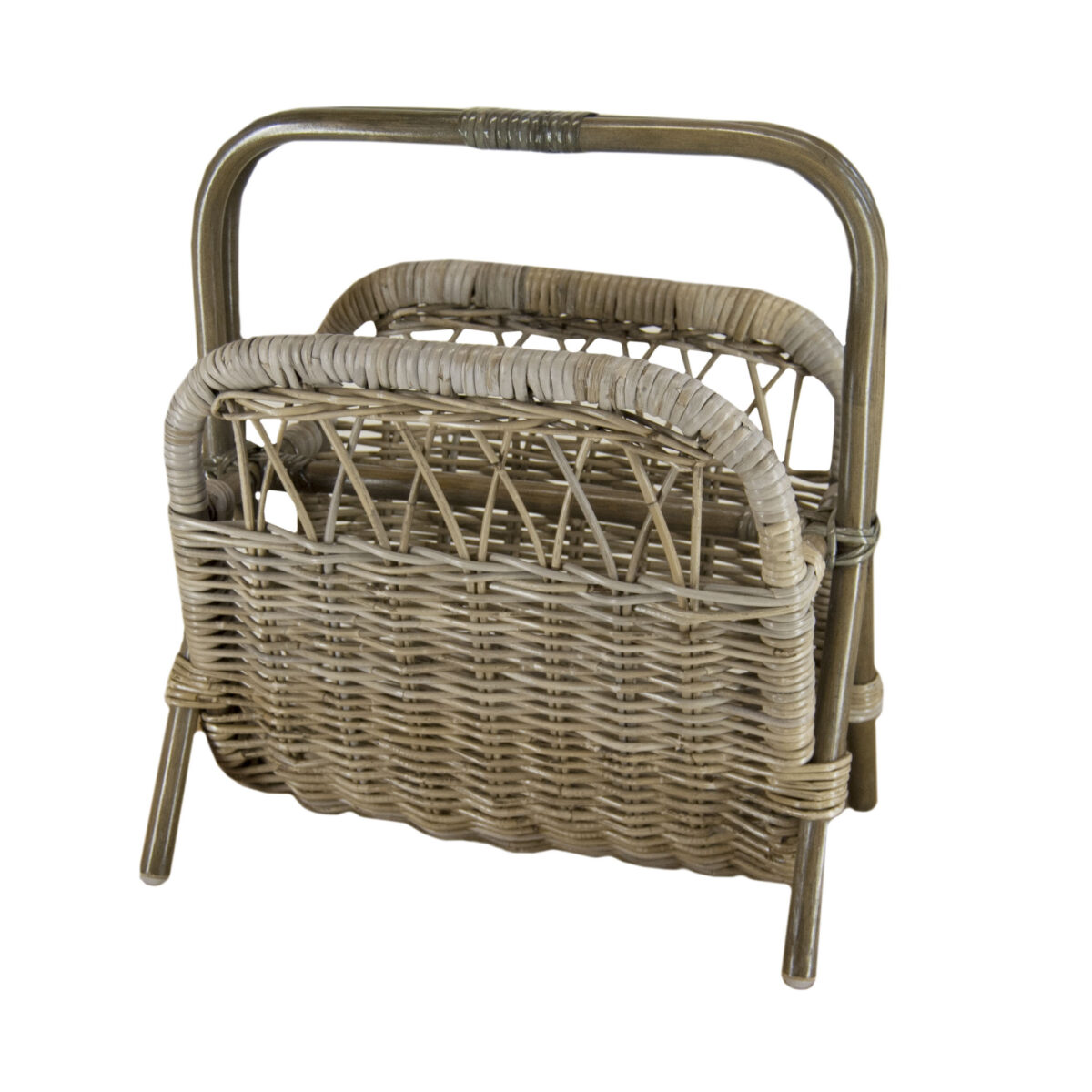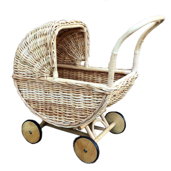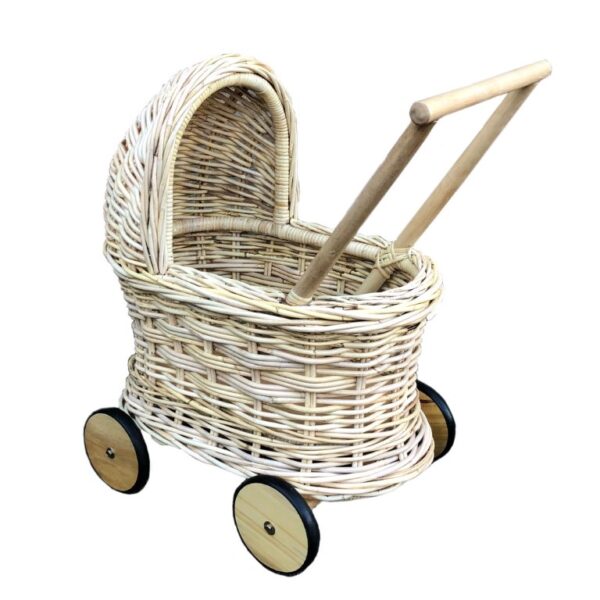 Deze stoere rieten poppenwagen heeft een houten duwer en houten wieltjes.