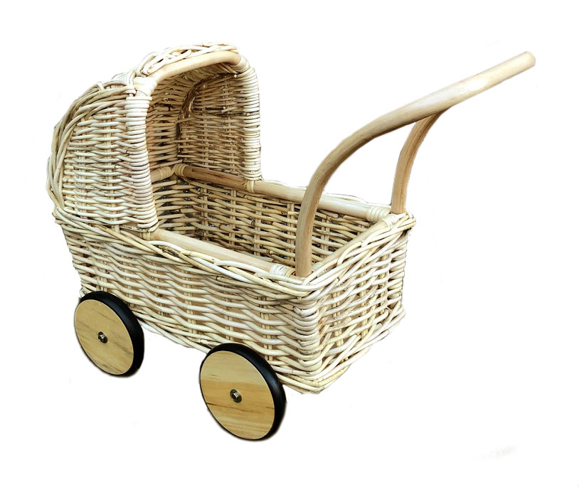 De rieten poppenwagen heeft houten wielen met rubberen bandjes, loopt geruisloos!