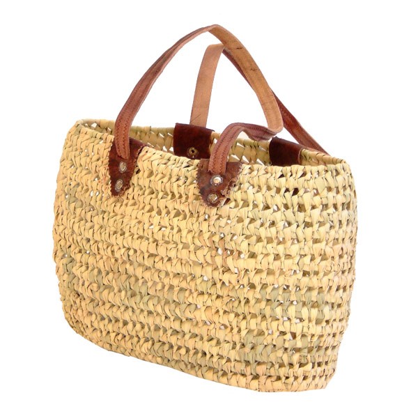 Rieten draagtas, gemaakt van palmblad met lange leren hengsels.