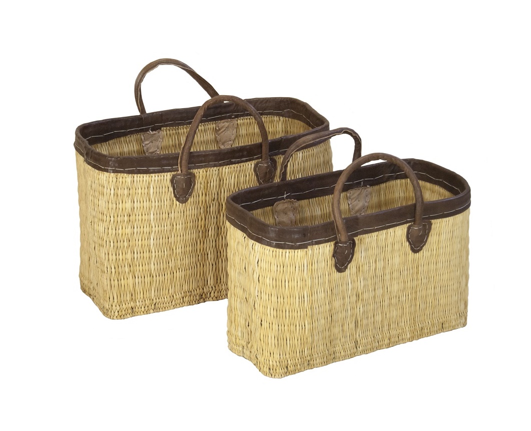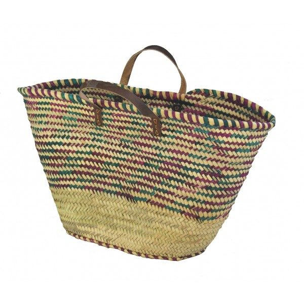 Luxe boodschappen tas van mais met lederen rand en lederen handvatten.