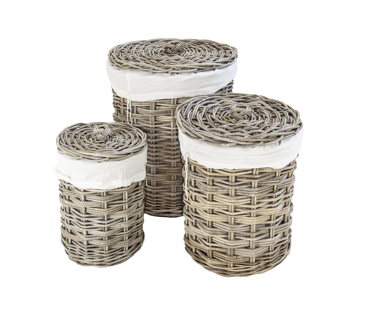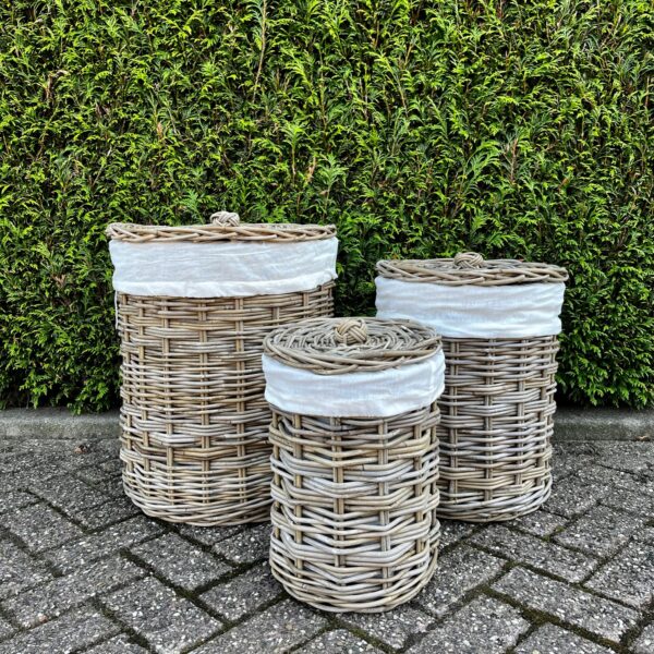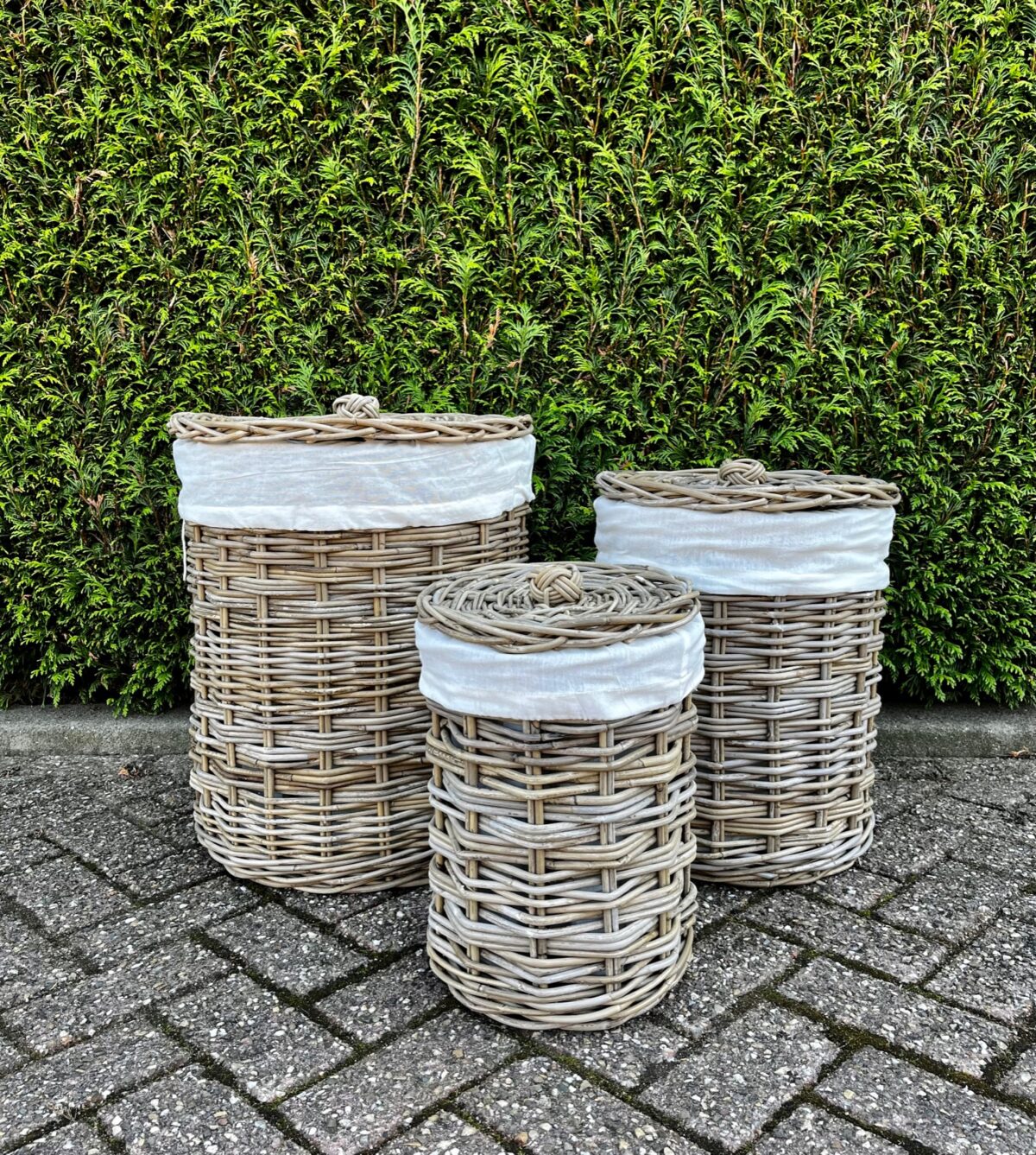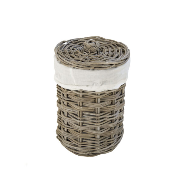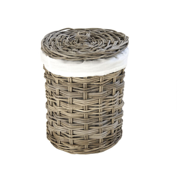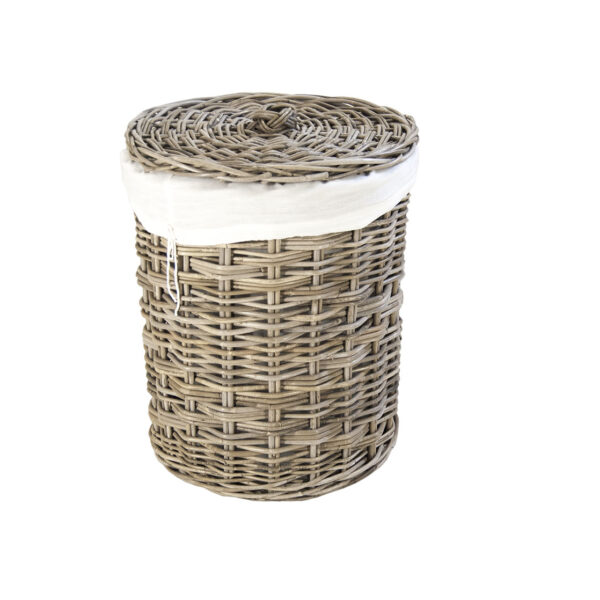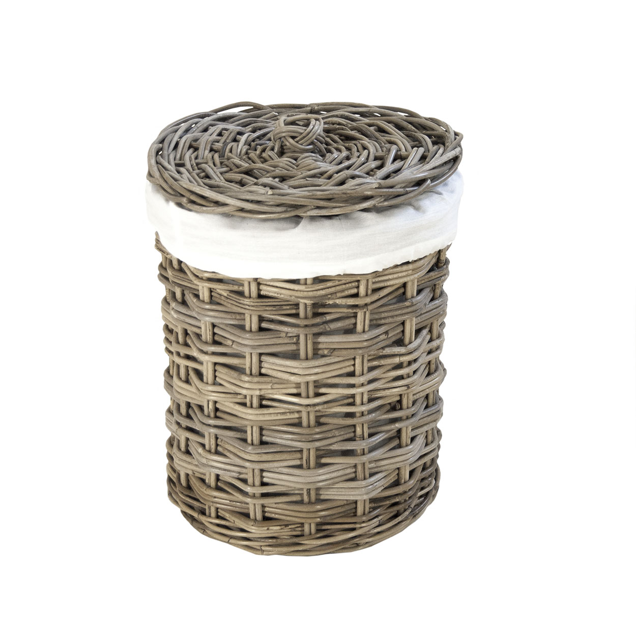 Een ronde wasmand, gemaakt van rotan in Grey kleur met afneembaar deksel.