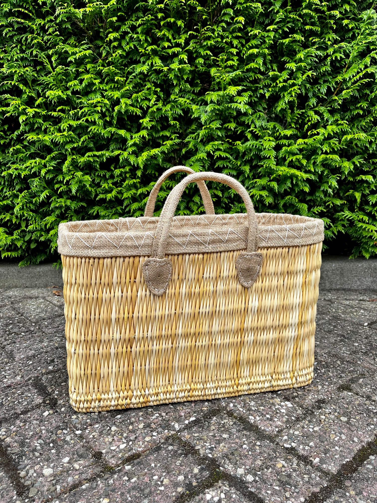 Rieten draagtas / boodschappentas met jute sier rand en handvaten.