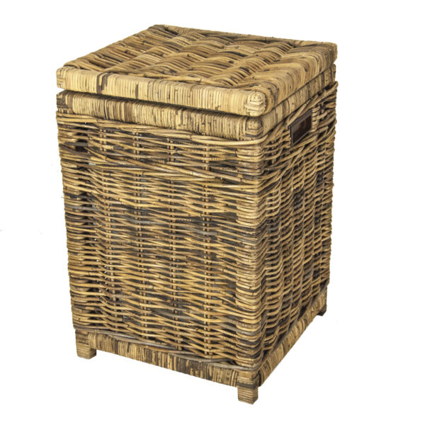 Robuuste rechthoekige rieten mand gemaakt van Brown rotan. Zeer gebruiksvriendelijk door de stevige scharnieren in het deksel en gemakkelijk verplaatsbaar door de handgrepen in de zijkant.