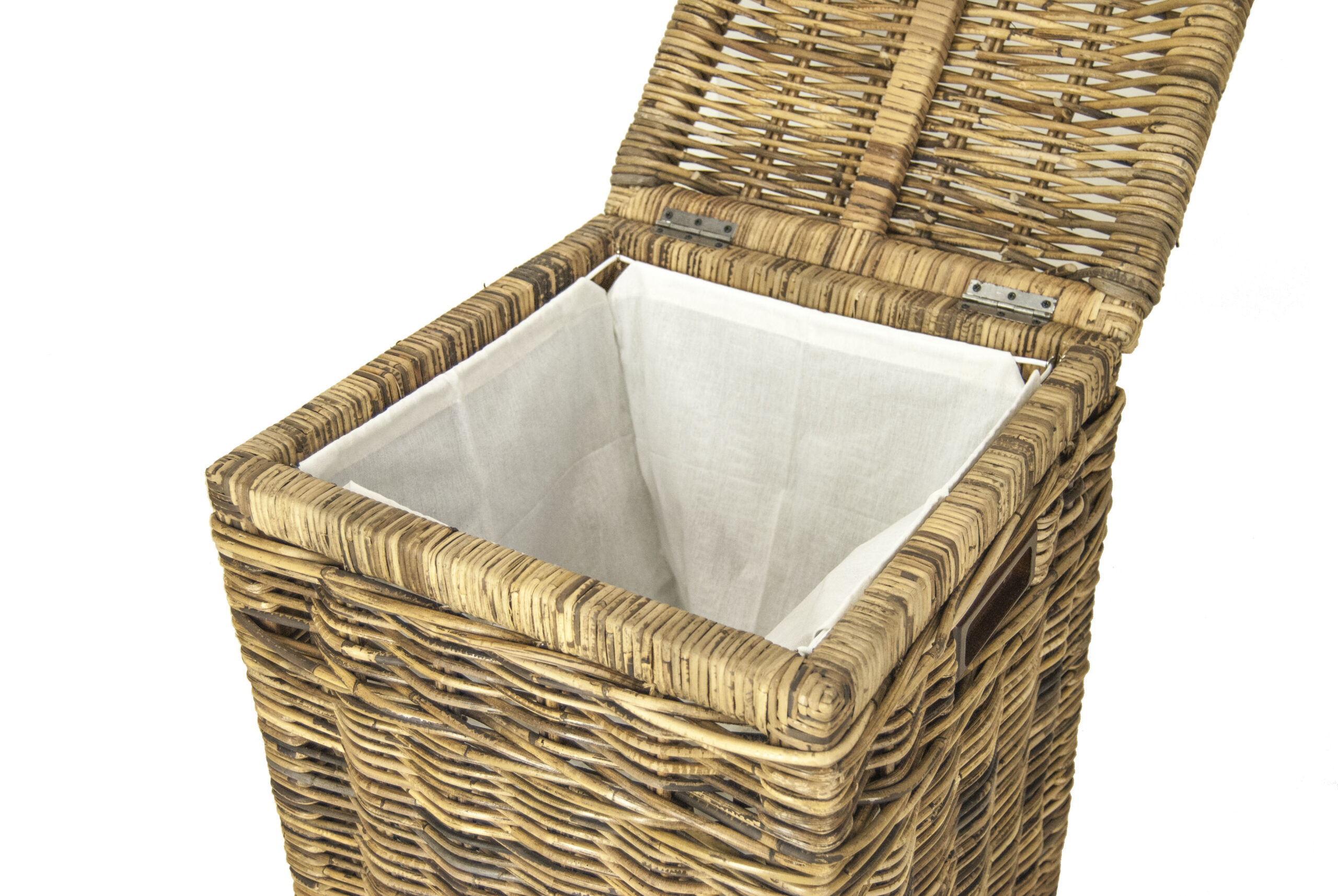 De rieten mand is gemakkelijk te verplaatsen door de handgrepen aan de zijkant en heeft een uitneembare binnenvoering / waszak.